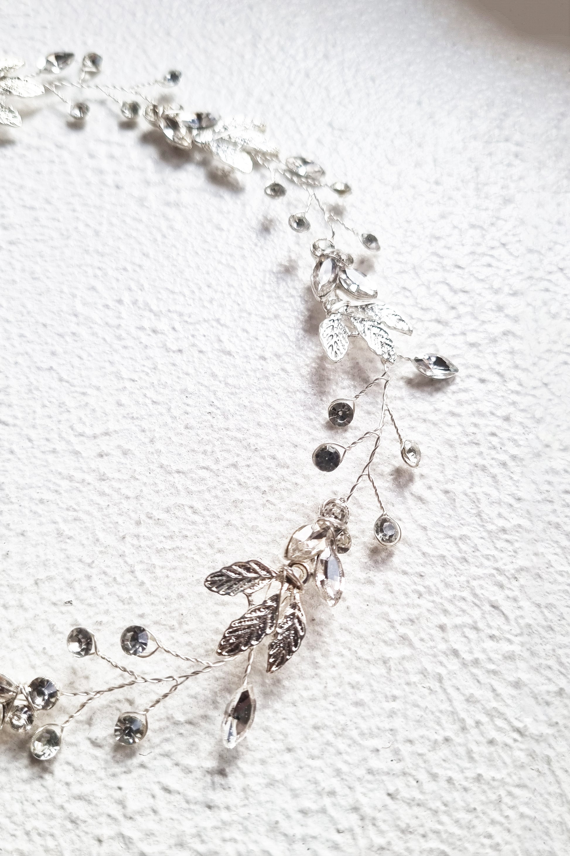 Our dainty leaf and crystal bridal hair vine brings a touch of ethereal beauty to your special day. This exquisite hair accessory combines delicate leaves with sparkling crystals, creating a refined and elegant look. The flexible design allows you to style this delicate leaf hair vine in various ways, weaving it through braids, securing it around a bun, or accenting an updo. Perfect for brides seeking a subtle and romantic touch, this crystal and leaf hair vine complements bohemian, classic, and modern wedding styles.