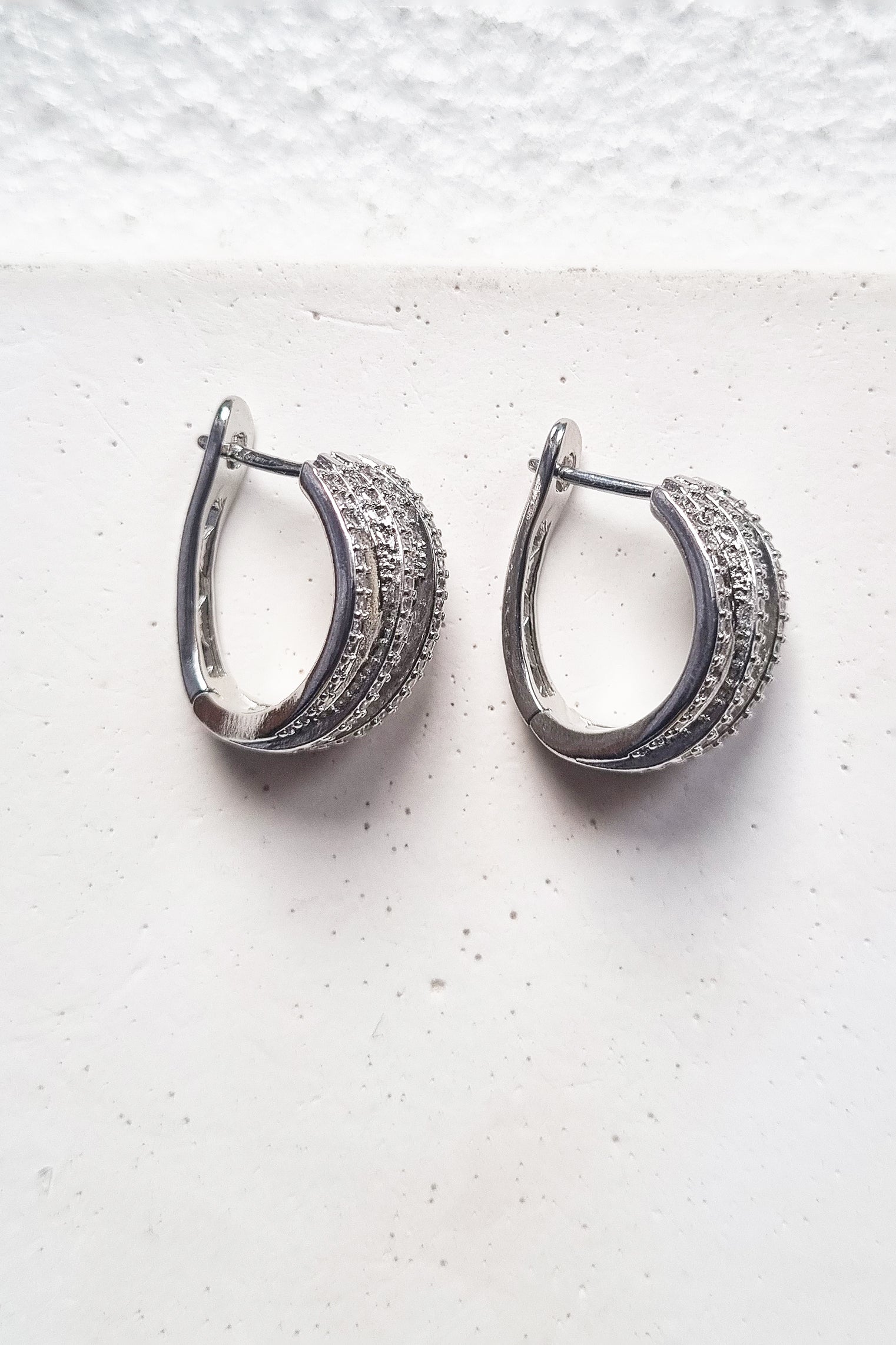 Wide silver CZ multi row hoop earrings. These striking earrings are designed for the customer who wants secure comfort combined with maximum glamour. Featuring multiple bands completely paved with shimmering cubic zirconia stones, the unique, wide profile creates a luxurious statement hoop look. Crafted from durable rhodium-plated brass, these earrings maintain a bright, tarnish-resistant silver finish. Their secure huggie style ensures they sit perfectly and are comfortable for extended wear. These modern silver cubic zirconia earrings are an exceptional choice for special occasions, formal events, or simply adding sophisticated sparkle to your daily style.